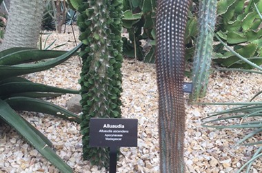 Most of the plants in this room are succulents, which means they are adapted to retain water, thus having the ability to survive long periods of drought conditions. Some succulents store water in their roots, others in their stems or leaves. Although the plants here share an adaptation to a desert environment, this room does not reflect a real desert. There are plants in this room from Africa, Asia, the Americas and all over the world that, in nature, would not be growing side-by-side or within such close proximity to one another.